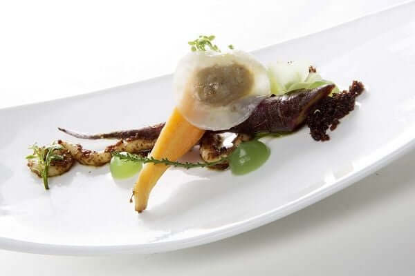 Lavar las zanahorias moradas, secar y envasar al vacío junto con la sal y el azúcar y el aceite de oliva virgen extra de España. Cocinar a 90 2 C durante 35 min. en un Fusion Chef Julabo. Enfriar hasta 2 ºC. Sacar de la bolsa y cortar 6 piezas del mismo tamaño a partir de la punta. Cortar con la parte final una pieza del tamaño de un dedo y ahuecar.